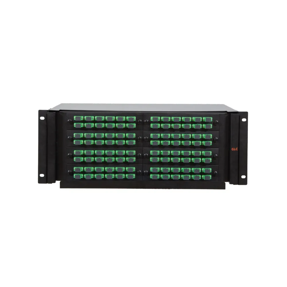 Bandeja de fibra óptica con adaptadores SCAPC y 96 pigtails incluidos, lista para instalación masiva.