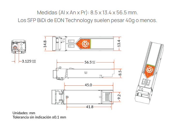 Transceiver SFP 1G Bidireccional BX-U, monomodo, 40km, 1490nm TX 1550nm RX, LC Simplex, DDMDOM, MSA, COM, garantía 5 años.