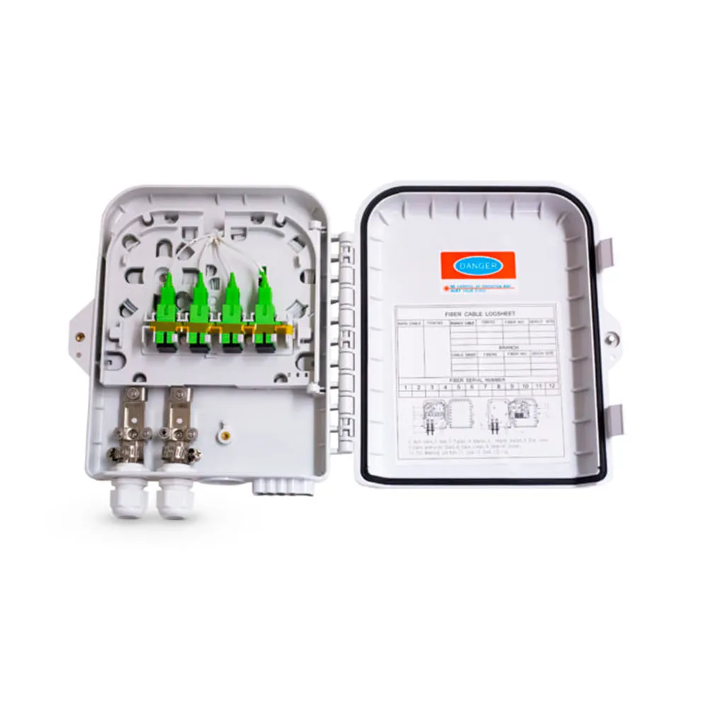 Caja exterior FTTH 2×8 con 1 splitter 1×8, conectores SCAPC y 8 adaptadores SCAPC