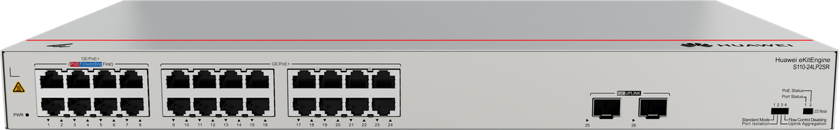 Switch Huawei de 24 puertos 10/100/1000BASE-T con PoE+, 2 puertos GE SFP, capacidad de switching de 52Gbps y rendimiento de 38.69 Mpps. Soporta funciones avanzadas de seguridad, agregación e infraestructura flexible.