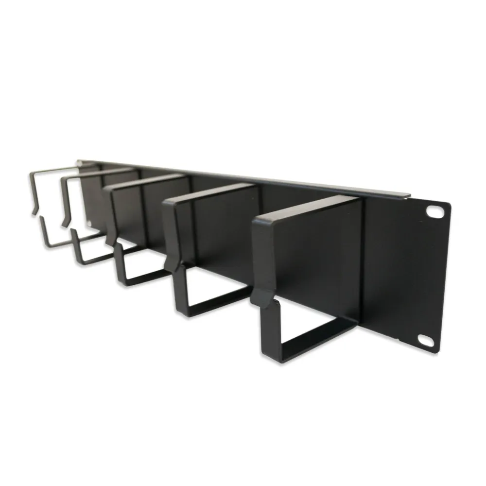 Organizador de cables para rack de 2U, mantiene orden en instalaciones.