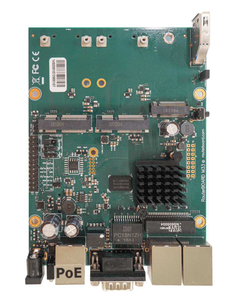 Placa RouterBOARD con 3 puertos Gigabit Ethernet, 2 ranuras miniPCI-e, 2 ranuras SIM y un puerto USB.