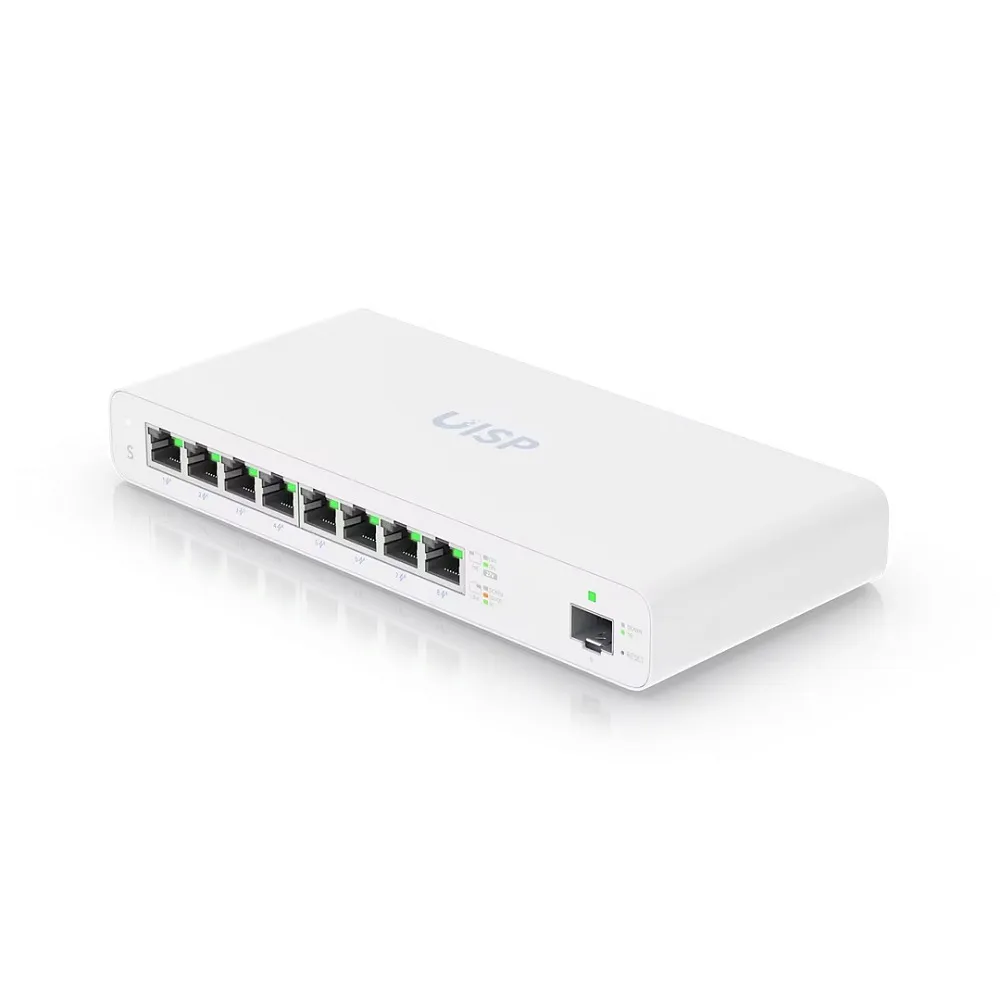 Switch Ubiquiti UISP-S de 8 puertos Gigabit con PoE pasivo de 27V y 1 puerto SFP para conexiones flexibles y eficientes.