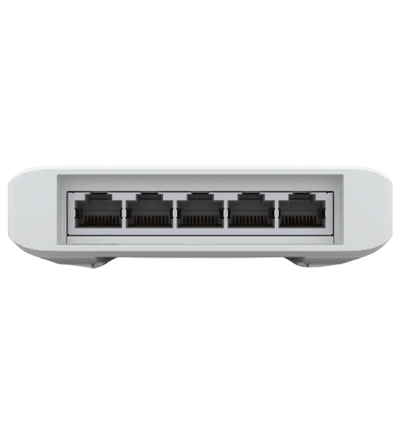 Switch UniFi Flex XG segunda generación con 5 puertos, incluyendo 1 GbE y 4 puertos 10GbE para redes de alta velocidad.