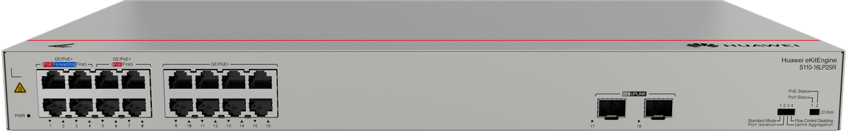 Switch Huawei de 16 puertos 10/100/1000BASE-T con soporte PoE de hasta 124W, más 2 puertos GE SFP. Ofrece capacidad de conmutación de 36Gbps y rendimiento de 26.78 Mpps, con funciones de aislamiento y agregación de puertos.